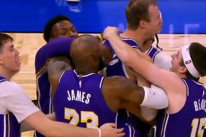 GIF-魔术最后扔一个不中~!!湖人众将围着肯纳德疯狂庆祝~!!!