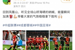 赛后为蓉城首发踢满全场的胡荷韬更新社媒庆祝胜利,他写道:
