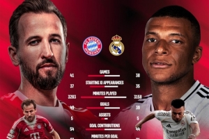 体育资讯4月15日讯 北京时间明天凌晨,拜仁将在欧冠1/4决赛次回合比赛中主场对阵皇马,首回合拜仁2-1取胜。拜仁官方社媒晒出了凯恩、姆巴佩本赛季的数据。