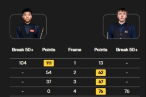 范争一打出单杆104、119、57、54分,本·默滕斯轰出140分,范争一5-4领先默滕斯结束第一阶段。